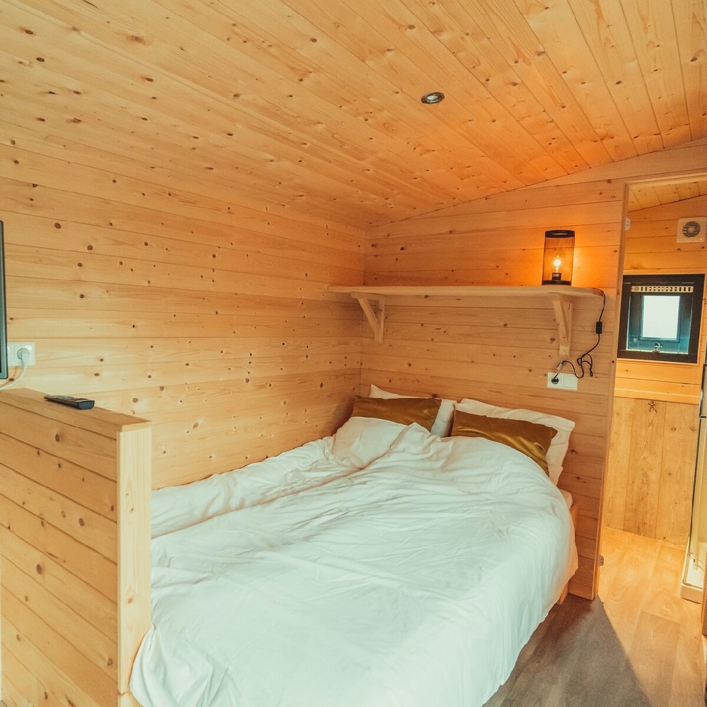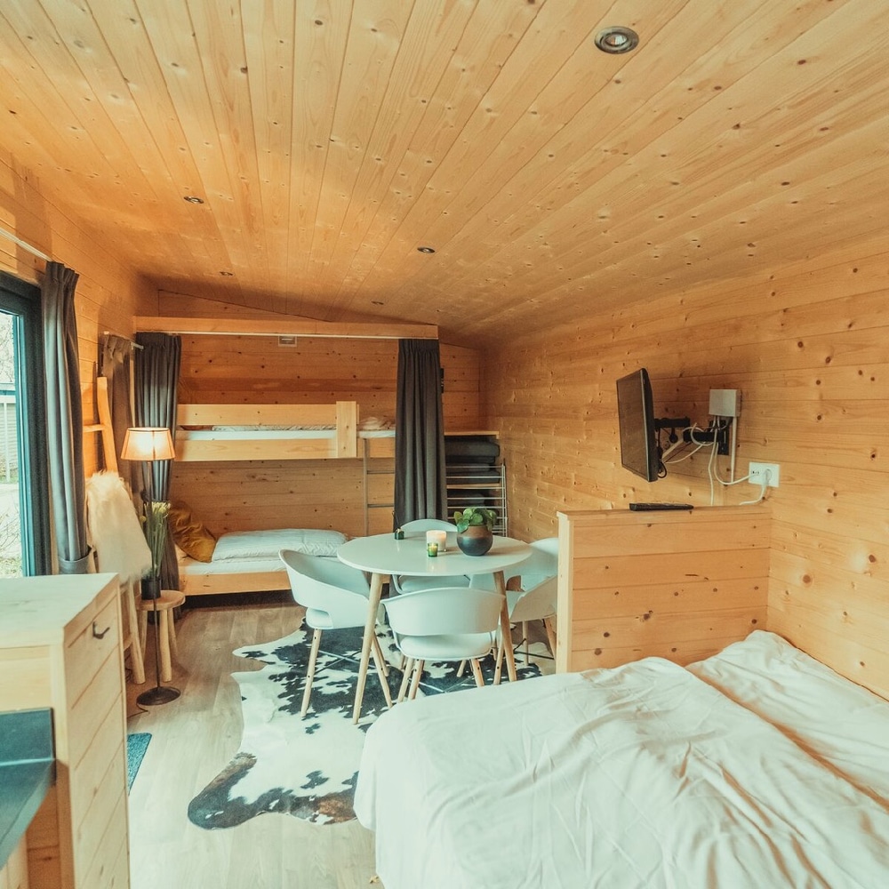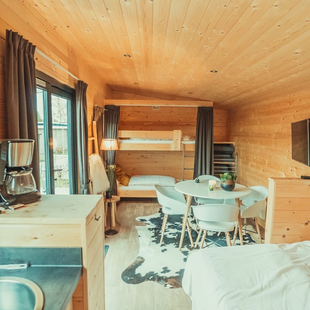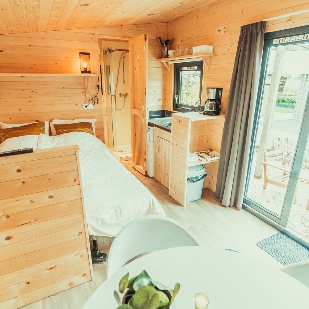 De tiny house bestaat, als je het sanitair niet meetelt, uit een enkele ruimte die door de slimme indeling alles biedt wat je nodig hebt voor een aangenaam verblijf. De ruimte is ingericht met een zithoek, keukenblokje, televisie, tweepersoonsbed en een stapelbed. Er zijn een douche en toilet aanwezig in de tiny house en buiten op het terras staat een comfortabele loungeset.